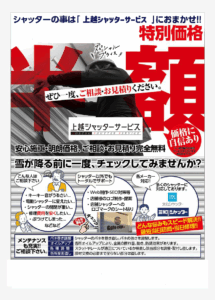 シャッターが重たくて妻が開けるのをつらいと言っていたので上越シャッターサービスさんに依頼しました。シャッターのバネを巻き直してもらいシャッターが軽くなって助かりました。
