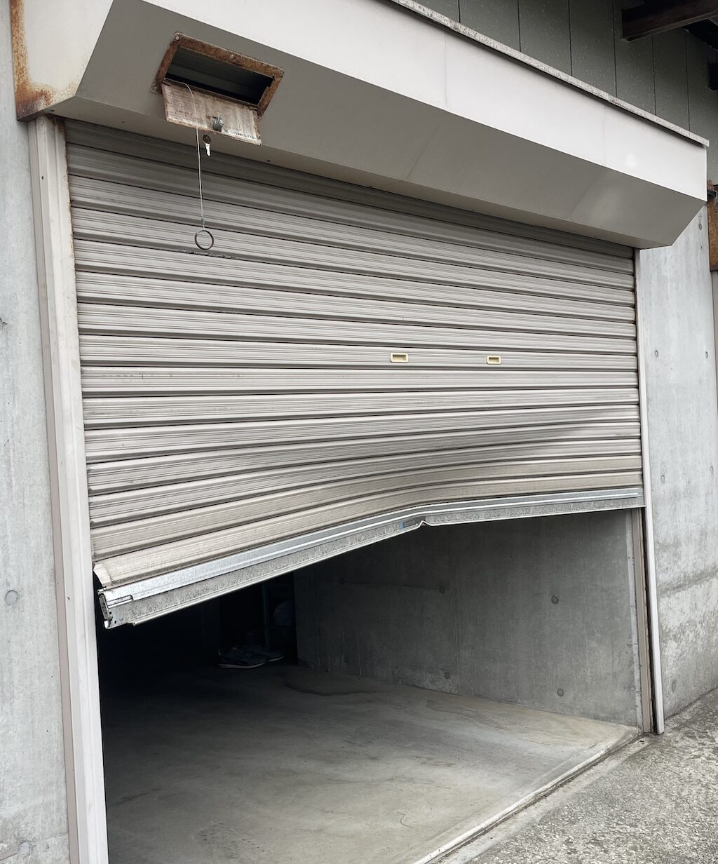 車庫のシャッターに車が接触し、スラット(カーテン)が凹んで変形。
